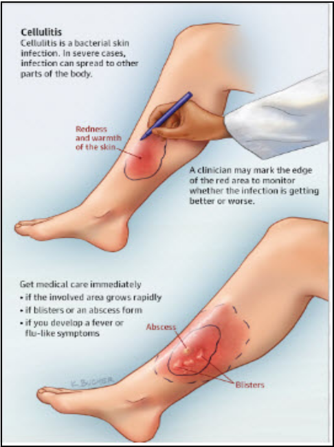 Selülit, cildin enfekte olmuş bölgesinde kızarıklık, şişme ve ağrıya neden olan yaygın bir bakteriyel cilt enfeksiyonudur. Tedavi edilmezse yayılabilir ve ciddi sağlık sorunlarına neden olabilir…)Kaynak Hastalık Kontrol ve Önleme Merkezleri ( CDC ), Amerika Birleşik Devletleri’nin ulusal halk sağlığı kurumu